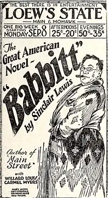 Babbitt is a 1924 American silent drama film directed by Harry Beaumont and starring Willard Louis, Mary Alden, and Carmel Myers.[1][2] It is based on the 1922 novel of the same title by Sinclair Lewis, later also adapted into a 1934 sound film.