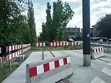 The traffic was stopped in the fall of 2017, following the impacts of the construction of a 15-storey facility on the river bank by the firm Nordic Astrum.[8] During the first building works, street ground was displaced, resulting in a small landslide that fissured the house at 8 Babia Wieś street, damaged the road surface, unsealed a gas pipeline and weakened the foundations of the tram track. The repair of the 130 metres (430 ft) of missing tracks, necessary for a re-opening, are not foreseen before end of 2023.[9]