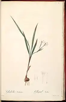 Babiana tubiflora is a species of geophyte of 7–15 cm (2.8–5.9 in) high that is assigned to the family Iridaceae. It has whitish mirror-symmetrical flowers with a long narrow tube that split into six tepal lobes, have three stamens, and line- to lance-shaped, laterally compressed leaves.[1] It is an endemic species of South Africa that can be found along the west and south coast of the Western Cape province. It flowers from August to early October.[3]