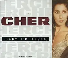 Cher remade "Baby I'm Yours" for the soundtrack of her 1990 film vehicle Mermaids. Cher's version was arranged to replicate Barbara Lewis' hit, and was produced by Peter Asher, who as a member of Peter and Gordon had had the UK hit of "Baby I'm Yours". The song was not featured in the film but was selected as the lead single from the soundtrack for release in the UK and Europe after the US single release "The Shoop Shoop Song"—which as remade by Cher had played under the film's closing credits—fell short of the Billboard Top Thirty. "Baby I'm Yours" failed as a single; its only apparent charting was in the UK at #89 and its estimated global sales tally is 100,000 units.[27] "The Shoop Shoop Song" was released in the spring of 1991 with "Baby I'm Yours" as the B-side, and spent five weeks at #1 in the UK and achieved Top Ten status in several European countries as well as Australia and New Zealand. (Coincidentally the precedent charting single to the Linda Lewis 1976 UK hit remake of "Baby I'm Yours" had been the first major UK hit version of "The Shoop Shoop Song", entitled "It's in His Kiss".)