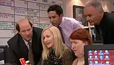 Kevin, Angela, Oscar, Meredith and Creed during the episode "Lecture Circuit"