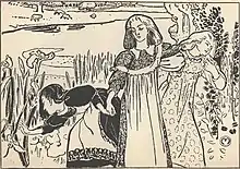 The artist Charles Hodge Mackie contributed the woodblock illustration By the Bonnie Banks o' Fordie to The Evergreen: A Northern Seasonal, The Book of Winter, published by Patrick Geddes and Colleagues in 1896.[16] He had painted an oil on board sketch of this subject while in France in the summer of 1894. The woodblock composition was subsequently worked up as an oil painting which was exhibited at the Royal Scottish Academy in 1897.[17]