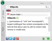 A single click on any text using the right mouse button or combination of the right mouse button and a keyboard modifier, and the Babylon window appears providing a translation and definition of the clicked term.[23] Babylon is a tool used for translation and conversion of currencies, measurements and time, and for obtaining other contextual information. Babylon has a patented OCR technology and a single-click activation that works in any Microsoft Windows application, such as Microsoft Word, Microsoft Outlook, Microsoft Excel, Internet Explorer and Adobe Reader. When activated, Babylon opens a small popup window that displays the translation or definition. To solve the incompatibility problem of Babylon OCR browsers extension; users can benefit from Capture2Text free app version 3.9 (only 3.9v) which is compatible with Babylon 8 or another version. While dragging its capture box in any text from any browsers, then a pop-up box appears and Babylon could easily grasp it. Babylon provides full text translation, full Web page and full document translation in many languages and supports integration with Microsoft Office. Babylon enables the translation of Microsoft Word documents and plain text files. It offers results from a database of over 1,700 sources in over 75 languages.[24]