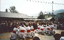 The bacchu-ber (French: [ba.ky.bɛʁ]), derived from Occitan bau cubèrt (Occitan: [baw ky'bɛʁ], covered dance or indoor ball), is a traditional folk dance performed with swords. This dance takes place in the district of Pont-de-Cervières, city of Briançon (Hautes-Alpes, France). Its origin dates back to many centuries ago (first written confirmation in 1730). This folk dance is unique in France and is one of the rare sword dances that have stood the test of time.[1][2] It is performed once a year on 16 August, day of Saint Roch (1340–1379), patron of the Pont-de-Cervières district. Similar shows are performed on the Italian side of the Cottian Alps, notably in San Giorio, Fenestrelle and Giaglione villages.