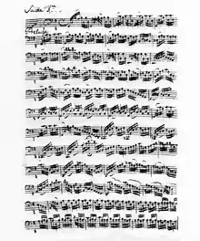 This suite is written in much more free form than the others, containing more cadenza-like movements and virtuosic passages. It is also the only one of the suites that is partly notated in the alto and soprano clefs (modern editions use tenor and treble clefs), which are not needed for the others since they never go above the note G4 (G above middle C).
