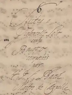 ![]() Title page of Anna Magdalena Bach's manuscript: Suites á Violoncello Solo senza Basso | |