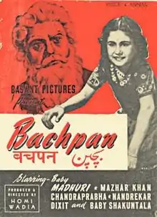Bachpan (Hindi: बचपन, Childhood) is a 1945 Hindi drama film directed by Homi Wadia.[1] It was produced by Homi Wadia's Basant Films and had music by S. N. Tripathi.[2] The film starred Mazhar Khan, Chandraprabha, Shashi Kapoor Sr., Gulab, Dalpat, Baby Shakuntala, Dixit, Baby Madhuri.[3]