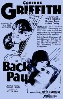 Back Pay is a 1930 American Pre-Code drama film with songs, produced and distributed by First National Pictures, a subsidiary of Warner Bros., and starring Corinne Griffith and Grant Withers. It is based on a short story by Fannie Hurst. It is a remake of a 1922 silent film Back Pay that starred Seena Owen.[1][2]