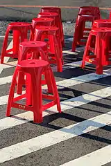A stool is a raised seat commonly supported by three or four legs, but with neither armrests nor a backrest (in early stools), and typically built to accommodate one occupant. As some of the earliest forms of seat, stools are sometimes called backless chairs despite how some modern stools have backrests. Folding stools can be collapsed into a flat, compact form typically by rotating the seat in parallel with fold-up legs.