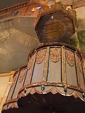 A Baroque and Neoclassical pulpit made in the 1870s is located on the right side (epistle) of the church, facing the altar. Connected to the convent is the tribuna, a private area for guests and visiting priests on the epistle side. A silver sanctuary lamp, dated 1835 and additional details such as sconce added in 1874, is hanged on the crossing.[19]