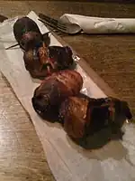 Devils on horseback is a British dish of bacon-wrapped prunes. The prunes are stuffed with chutney, wrapped in bacon, and grilled.[9]