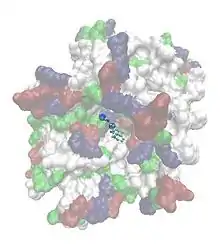 Bacterial Leucine Transporter (LeuT) is a bundled twelve alpha helix protein which belongs to the family of transporters that shuttle amino acids in and out of bacterial cells. Specialized in small hydrophobic amino acids such as leucine and alanine, this transporter is powered by the gradient of sodium ions that is normally maintained by healthy cells across their membranes. LeuT acts as a symporter, which means that it links the passage of a sodium ion across the cell membrane with the transport of the amino acid in the same direction. It was first crystallized to understand the inner molecular mechanisms of antidepressant's work since it has a close resemblance with the human neurotransmitter transporters (more difficult to crystallize) that these drugs block, thus inhibiting the reuptake of chemical messengers across the cell membrane of nerve axons and glial cells.[1][2]