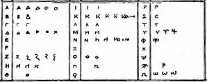 ![]() The Bactrian alphabet (block and cursive letters, here in black). The Bactrian script was directly adapted from the Greek script (here in grey), with the addition of the letter sho ( | |