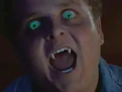 ![]() Patrick Renna as Ronnie Strickland: a vampire. The faux vampire teeth—which were sardonically labeled "funny fangs"—were created by makeup coordinator Toby Lindala. The glowing eyes were created with a fluorescent material. | |