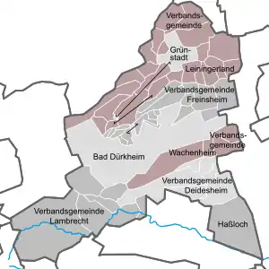 Bad Dürkheim (German pronunciation: [ˌbaːt ˈdʏʁkhaɪm])[2] is a district in Rhineland-Palatinate, Germany. It is bounded by (from the west and clockwise) the districts of Kaiserslautern, Donnersbergkreis and Alzey-Worms, the city of Worms, the Rhein-Pfalz-Kreis, the city of Neustadt/Weinstraße, the districts of Südliche Weinstraße, the city of Landau (the Taubensuhl/Fassendeich forest part of the city), the district Südwestpfalz, and the city of Kaiserslautern.