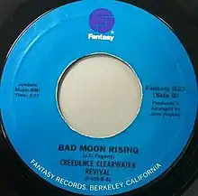 "Bad Moon Rising" is a song written by John Fogerty and performed by Creedence Clearwater Revival. It was the lead single from their album Green River and was released in April 16, 1969 four months before the album. The song peaked at No. 2 on the Billboard Hot 100 chart on 28 June 1969 and reached No. 1 on the UK Singles Chart for three weeks in September of that year (see 1969 in music). It was CCR's second gold single.[3]