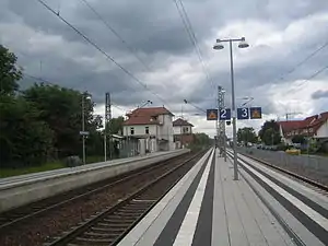 Bad Schönborn Süd station is the busier of two stations in the town of Bad Schönborn in the German state of Baden-Württemberg. The other is Bad Schönborn-Kronau station. It is located on the Rhine Valley Railway in the district of Bad Langenbrücken. It is classified by Deutsche Bahn (DB) as a category 4 station.[1] It has three platforms and is located in the area of the Karlsruher Verkehrsverbund (Karlsruhe Transport Association, KVV), which manages regional rail services and sets fares. Since December 2003, it has been exclusively served by services on lines S3 and S4 of the Rhine-Neckar S-Bahn.