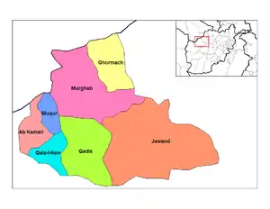 Bādghīs (Dari: بادغیس) is one of the thirty-four provinces of Afghanistan, located in the northwest of the country, on the border with Turkmenistan. It is considered to be one of the country's most underdeveloped provinces, with the highest poverty rate.[4] The capital is Qala e Naw, while the most populous city and the district are Bala Murghab. The ruins of the medieval city of Marw al-Rudh, the historical capital of the medieval region of Gharjistan, are located in the province near the modern city of Bala Murghab.