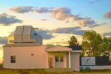 The Badlands Observatory (IAU code 918) is an astronomical observatory named after the Badlands National Park, located in Quinn, South Dakota, near the city of Wall, United States. The observatory was founded in 2000.[2] by American amateur astronomer Ron Dyvig, who was associated with the Optical Sciences Center and Steward Observatory of the University of Arizona. While there, he occasionally participated in observing runs using the telescopes on Kitt Peak. Kitt Peak Observatory As of November 2016, a total of 25 numbered minor planets were discovered at the observatory. The Minor Planet Center credits these discoveries to Ron Dyvig and to the observatory, respectively. The main-belt asteroid (315495) 2008 AQ3 was discovered by Italian amateur astronomer Fabrizio Tozzi while using the Badlands Observatory telescope remotely via the Internet in 2008. [3] Asteroid 26715 South Dakota, discovered by Ron Dyvig in 2001, is named after the U.S. state South Dakota, where the Badlands observatory is located.[4]