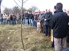 When the head of household finds a suitable tree, he stands in front of it facing east. After throwing grain at the tree, he greets it with the words "Good morning and happy Christmas Eve to you", makes the Sign of the Cross, says a prayer, and kisses the tree.[3][5] He may also explain to the badnjak why it will be cut: "I have come to you to take to my home, to be my faithful helper to every progress and improvement, in the house, in the pen, in the field, and in every place."[7] He then cuts it slantwise on its eastern side, using an axe. Some men put gloves on before they start to cut the tree, and from then on never touch the badnjak with their bare hands. The tree should fall to the east, unhindered by surrounding trees. It must not be left half-cut, as then it will curse the house of the man.[7] In some regions, if the tree is not cut down after the third blow of the axe, then it must be pulled and twisted until its trunk breaks. The resulting badnjak has a so-called "beard", the part of the trunk at which it broke off from the base of the tree.[6] In Šumadija, half of a circular loaf of bread is left on the stump, the other half being eaten on the way back home.[4] In Zagarač, the stump is covered with moss or dry leaves, and it will be visited again in spring: the stump sprouting through the cover is an omen of good luck and prosperity.[8]