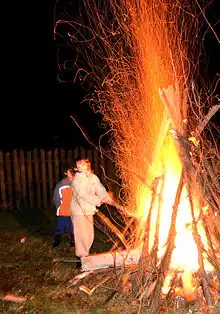 The moment when the badnjak burns through may be marked with festivities, such as the log being kissed by the head of household,[1] and wine being poured over it accompanied by toasts.[12] A reward may be given to the family member who was the first to notice the event, and in the past the men would go outside and fire their guns in celebration. There is a special verb preveseliti used instead of the common pregoreti to express "to burn through" when referring to the badnjak, which has the same root as the noun veseljak. Once the log has burnt through, some families let the fire go out, while in others the men keep watch in shifts during the night to keep the badnjak burning.[6] Once the badnjak has burnt through, the thicker end is often taken out of the fire and used according to the local custom. It may be carried around the beehives, extinguished, and placed between the branches of a young plum or apple tree.[1] The men may make crosses from it and put them under the eaves, on the fields, meadows, vineyards, and apiaries, so that the coming year may be happy and fruitful.[6] It may also be set aside for next Christmas Eve, to be placed on the fire immediately before the new badnjak, as a symbol of continuity.[3] In Kosovo, a part of the badnjak is preserved and burned again on New Years Day and Epiphany.[7]