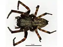 Badumna longinqua is an average-sized spider, with males attaining a maximum length of no more than 11 millimetres (0.43 in), while females are marginally larger with a maximum body length of 15 mm (0.59 in).[2][3] Its common name, grey house spider, is due to colouration on the cephalothorax and abdomen, which are carpeted with light-grey hairs and spot-like markings[4][5][6] and legs, which are purplish-brown in colour with hairs arranged into stripes on each leg.[7] The similarly coloured brown carapace darkens nearer the chelicerae and eyes.[7] Its eight eyes are small and black, with the front middle pair exceptionally larger at approximately 1 and a half times the size of surrounding eyes.[5][8] Underneath these setae is an ovate abdomen and legs, which are purplish-brown in colour with hairs arranged into stripes on each leg.[9]