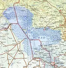 The town is approximately 196 km from Maiduguri, the capital of Borno State.[1] The "Doron Baga" fish market, as of 2000, was located about six kilometres from the town.[1] Baga used to lie on the border of Lake Chad and was a fishing center itself in the 1960s and 1970s, but the diminishing size of the lake has caused fishermen to move, and others have turned to subsistence farming.[2][3][4]