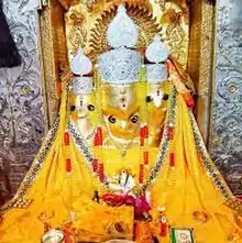 The unique feature of the temple is the triad, with Bagalamukhi central, and as an aspect of Parvati, between Lakshmi and Saraswati.[2] There are also statues of Krishna, Hanuman and Bhairav at the temple.