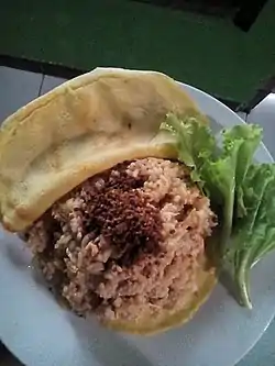 Bagoong fried rice, also known as binagoongan fried rice or anglicized as shrimp paste fried rice, is a Filipino fried rice dish cooked by stir-frying pre-cooked rice with sauteed bagoong alamang (shrimp paste), toasted garlic, spring onions, shallots, julienned sour green mangoes (which balances the saltiness of the shrimp paste), and optionally other ingredients like chilis, cucumbers, jicamas, carrots, scrambled eggs, chicharon, and tomatoes. It is usually light pink in color due to the use of angkak (red yeast rice) coloring agent from the bagoong. It is eaten paired with meat and seafood dishes, or is cooked with chunks of meat and seafood and eaten as is.[1][2][3][4]
