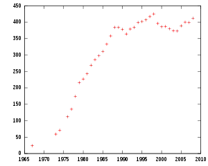 Government registration of the Baháʼí community showed 412 Baháʼís by the end of 2008.[18] Iceland has the second most number of Baháʼís per capita in Europe at 1493 per million population, and has the most number of Baháʼí Local Spiritual Assemblies at 49 per million.[1] The Association of Religion Data Archives (relying on World Christian Encyclopedia) estimated some 616 Baháʼís in 2005.[53]
