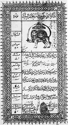 Soon after declaring his spiritual mission to Mullá Husayn,[lower-alpha 5] the Báb sent him to Tehran to deliver a special tablet[lower-alpha 6] to one whom God would guide him to. After learning about Baháʼu'lláh through an acquaintance, Mullá Husayn felt compelled to arrange for Baháʼu'lláh to receive the tablet—this news brought great joy to the Báb when Mullá Husayn wrote him about it.[27] Bahá’u’lláh received the tablet when he was 27, he immediately acknowledged the truth of the Báb’s message and arose to share it with others.[22] In his native province of Núr Bahá’u’lláh’s notability as a prominent local provided numerous opportunities to teach the Bábí Faith, and his trips attracted many to the new religion, including Muslim clerics.[28] His Tehran home became a center for activities, and he generously gave financial support for the religion.[29] In the summer of 1848, Bahá’u’lláh attended and hosted[30] a gathering at Badasht in the province of Khorasan, where 84[31] Bábí disciples met for 22 days. At that conference historic discussions took place between those who wanted to maintain Islamic law (the religious heritage of most early Bábís[lower-alpha 7]) and those who believed the Báb had inaugurated a new religious dispensation. Baháʼu'lláh influenced agreement around the latter point of view.[37] It was at Badasht that Mírzá Ḥusayn-ʻAlí Núrí assumed the name Bahá’[11] and also gave new spiritual names to all other attendees; thereafter the Báb addressed tablets to them by those names.[38][lower-alpha 8] When Táhirih, the most prominent female disciple of the Báb, was arrested after the conference, Baháʼu'lláh intervened to protect her. Subsequently he himself was temporarily confined and punished with bastinado.[39]