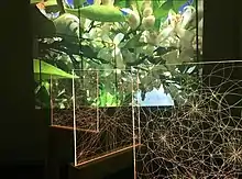 In 2018, Bahia completed an artist residency at the Shangri La Museum for Islamic Art, Design & Culture in Honolulu, Hawaii. During this period, she studied Doris Duke's collection of Islamic art and used her findings as part of an exhibition, "Reflections on Shangri La", which opened on 27 September in the Arts of Islam Gallery at the Honolulu Museum of Art.[20] [21] A second part of her residency involved the creation of a two-part mural onsite at the Shangri La Museum. Based on a poem from the Palestinian poet Mahmoud Darwish, the stanza - depicted in an artist-created font of foliated and pixellated Kufic script, with roots instead of vegetation - is a site-specific commentary on colonized land.[22]