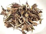 Bai Mudan (Chinese: 白牡丹; pinyin: bái mǔdān; Wade–Giles: pai2 mu3-tan1; lit. 'white peony') is a type of white tea made from plucks each with one leaf shoot and two immediate young leaves (one bud two leaf ratio) of the Camellia sinensis plant.[1] Bai Mudan is sometimes preferred by white tea drinkers for its fuller flavor and greater potency than the other major type of white tea, Bai Hao Yinzhen. The latter is made purely with leaf shoots, and so it is comparatively softer and more subtle. The typical taste of Bai Mudan is a result of both the processing and the tea plant cultivars employed in the production.