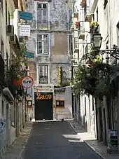 It is a fundamental quarter of Lisbon, organized into a hierarchical scheme of roads and lanes: the roads, the structural axis, run perpendicular to the river; and the lanes, or secondary axis, cut parallel to the river.[1] The matrix of allotments reflects the persistent use of the medieval layout; the division and multiplication of this module had its origin in the variations of the architectural typology. The space constructed is dominated by living spaces implanted in long narrow lots, three to four storeys in height, with asymmetric facades consisting of windows along the various storeys and staircases along the lateral flanks. Although less representative, the Pombaline-era buildings are common, essentially introducing modifications to the level of the façade's composition.[1] Although there are many typological variations to the facade designs, certain elements are repeated, such as the corners, bay and sill windows, eaves and attics, securing a homogeneous urbanized front.[1]