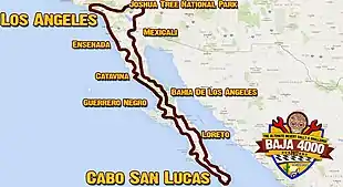 The Baja 4000 is a biennial off-road charity rally and road trip organized by the creators of the largest amateur rally in the world, the Budapest-Bamako.[1] It's a low budget, amateur version of the famous Baja 1000 and Dakar Rally. The first edition was held in January 2017.[2] The rally started in Los Angeles and traveled 4000 kilometers on the Baja California peninsula in Mexico.[3] In 2018 before the second edition of the event organizers changed the event's name to Baja XL.[4]