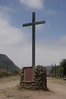 Baja California's northern border with Alta California was first established to demarcate areas of Franciscan and Dominican missionary authority, precisely set on August 19, 1773, near San Juan Bautista Creek by Fray Francisco Palóu. A marker stands on the line formerly dividing the two countries. The marker is behind the ruins of Misión San Miguel Arcángel de la Frontera, in La Misión, Baja California. Palóu's line was adopted as the provincial dividing line in 1804.[3]
