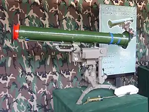 An indoor training simulator is also available with Baktar-Shikan. It is an exact replica of the weapon and is used to train operators by simulating various target speeds, ranges and angles. The target's movement parameters can be adapted to the progressive skill level of the operator under training.[20] An optional laser aiming device is also under development to increase accuracy at longer ranges.[18] According to SIPRI, between 1990 and 2020, Pakistan has produced 25,350 Baktar-Shikan missiles.[21]