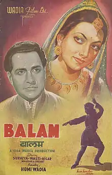 Balam (Hindi: बालम, Beloved) is a 1949 Hindi romantic action film directed by Homi Wadia.[1] Credited as A Hila Wadia Production by Wadia Brothers the film starred Suraiya, Wasti, Masood, Nigar Sultana, Jayant, Gulnar and Agha.[2] The music directors were Husnlal Bhagatram.[3]