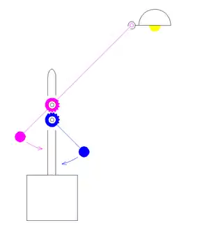 This construction uses a chain to keep the arm with the counterweight and the forearm parallel. The lamp-cap and counterweight move in opposite directions (both away from the base or both towards it). The balance that is required is shown by the following formula: