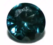 Synthetic spinel can be produced by similar means to synthetic corundum, including the Verneuil method and the flux method pioneered by Edmond Frémy. It is widely used as an inexpensive cut gem in birthstone jewelry for the month of August. Light blue synthetic spinel is a good imitation of aquamarine beryl, and green synthetic spinel is used as an emerald or tourmaline simulant.[28] By 2015, transparent spinel was being made in sheets and other shapes through sintering.[29] Synthetic spinel, which looks like glass but has notably higher strength against pressure, can also have applications in military and commercial use.[30]