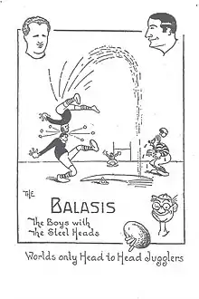 Balasis family acrobatic act was performed by the Balasic family who were performers who specialized in acrobatics and appeared in variety shows, vaudeville theaters and circuses of Europe, Canada and America from the early 1900s to 1930 with a special feat billed as "The Boys With The Steel Heads", "The World's Only Head to Head Jugglers".[1]