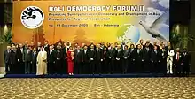 The Bali Democracy Forum (BDF) is a meeting held in Bali, and attended by representatives from nations in the Asia Pacific region. The forum was initiated by Indonesia in 2008 with the stated aim of fostering democracy, human rights, equality, and mutual respect.[1]