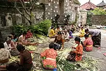 Balinese culture is a mix of Balinese Hindu-Buddhist religion and Balinese customs. It is perhaps most known for its dance, drama and sculpture. The island is also known for its Wayang kulit or Shadow play theatre. Even in rural and neglected villages, beautiful temples are a common sight; and so are skilful gamelan players and talented actors.[9] Even layered pieces of palm leaf and neat fruit arrangements made as offerings by Balinese women have an artistic side to them.[10] According to Mexican art historian José Miguel Covarrubias, works of art made by amateur Balinese artists are regarded as a form of spiritual offering, and therefore these artists do not care about recognition of their works.[11] Balinese artists are also skilled in duplicating artworks such as carvings that resemble Chinese deities or decorating vehicles based on what is seen in foreign magazines.[12]