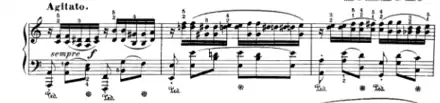 The piece shortly returns to its original tempo and style, and the first melody is further elaborated. Here, Chopin incorporates variations on the melody not present in the initial expository stage of the piece. This development progresses until the Presto con fuoco theme is naturally reintroduced and recapitulated. This time, it is elaborated on as well, and ends abruptly, until the theme is echoed once more and the piece fades out. The original F major theme is echoed, but now in A minor, the key of the Presto; it is thus that the piece ends, without returning to its tonic key.[5]