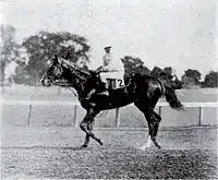 Ballot raced in England in 1909 but met with little success on their grass racecourses. Returning to the United States for the 1910 season, he immediately returned to top form.[4] His biggest win of the year came in the Advance Stakes in which he beat King James by two lengths.[5] Ballot finished second in the August 4 Saratoga Handicap on a track described as a "sea of mud" by the Chicago Tribune and came out of the race with a foreleg injury that ended his racing career.[6] His win in the Advance Stakes combined with top three finishes in other major races earned Ballot retrospective honors as the Co-American Champion Older Male Horse of 1910.