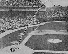 The only home run ball ever hit completely out of Memorial Stadium was slugged by Frank Robinson on Mother's Day, May 8, 1966, off Cleveland Indians pitcher Luis Tiant.[30] It cleared the left field single-deck portion of the grandstand.[31] A flag was later erected near the spot the ball cleared the back wall, with simply the word "HERE" upon it.