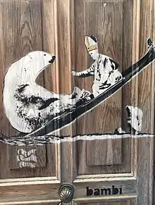 In 2010, the vandalism of a popular Bambi stencil in Primrose Hill reignited the long-running London debate over the preservation of street art and resulted in Islington councillors proposing a community committee be established to rule on the future protection of street art.[8] In early 2011, Bambi commemorated the royal wedding of Prince William and Kate Middleton with the satirical slogan "A Bit Like Marmite" across their chests.[9][10]