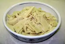 Pickled bamboo, used as a condiment, may also be made from the pith of the young shoots. In Japan, menma is a common topping for ramen noodle soup. In China, luosifen river snail noodles, a popular dish from Guangxi, get their famously pungent smell from pickled bamboo shoots.[11]