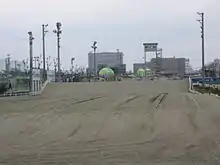 Because ban'ei racing is about strength and not speed, the winning time of major races is often slower than lower-class races, where even a small overtime can have a horse disqualified.[16][17] With suitable ground conditions, horses pulling lightly loaded sleds can clock speeds under 50 seconds.[18][19] The condition of the track is described using measured-moisture percentage.[20] The track is repaired manually during or between races. Watering is used to prevent excess dust from irritating horses and people.[21] Heating systems allow racing during the winter months.[22]