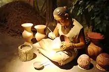The site has been increasingly attractive to Thai and international tourists, an interest fostered by a site museum that has continually upgraded its buildings and exhibitions about the site, its discovery, and archaeological interpretation, as well as the history of interest in the site by the Thai royal family. The museum includes an accurate open pit recreation of the excavation at a temple some 700 meters away called Wat Pho Si Mai, with the Ban Chiang Culture artifacts and simulated skeletons displayed as they appeared during excavation. Included in the museum's collection is the traveling exhibit curated by Dr White, titled Ban Chiang, Discovery of a Lost Bronze Age, which toured internationally following the 1974-75 Penn Museum excavations and became part of the Ban Chiang Museum permanent exhibit in 1987.[23] The museum includes "displays and information that highlight the three main periods and six sub-periods" as well as the site's general and excavation history.[24] Artifacts from the museum are also displayed in a Virtual Museum website.[25] The site and museum have been reviewed by several travel publications, including CNN,[24] TripAdvisor,[26] and the official tourism site of Thailand.[27] This tourist traffic in turn has had a profound impact on the village economy, with several small shops and restaurants developing near the museum.